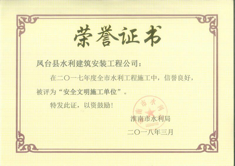 鳳臺縣水利建筑安裝工程有限公司榮獲2017淮南市“安全文明施工單位”