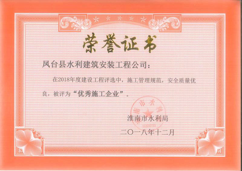 鳳臺縣水利建筑安裝工程有限公司榮獲淮南市水利局2018年度“優秀施工企業”
